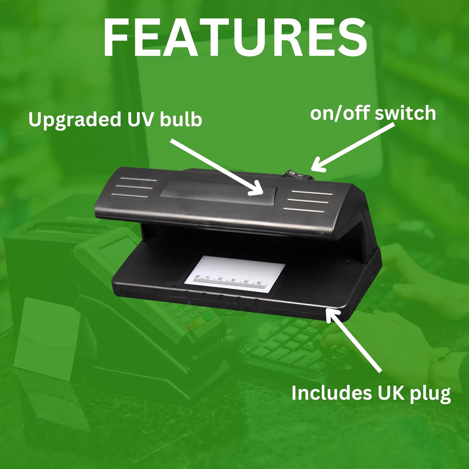 This UV money checker is a must-have tool for identifying counterfeit UK banknotes, passports, credit cards, and other documents with security features. Compatible with both the new polymer and old paper UK notes, it uses advanced ultraviolet (UV) light technology to reveal hidden security markings, watermarks, and other invisible features. Simply plug it in, switch it on, and start verifying notes in seconds with ease. Compact and lightweight, it measures just 18cm x 10cm, making it perfect for home, office, or retail spaces without taking up valuable room. Ideal for businesses such as shops, market traders, or cashiers, this device ensures quick and reliable counterfeit detection, helping prevent financial losses. Whether you're managing cash at work or checking documents at home, the UV money checker offers a simple, fast, and effective solution for security and peace of mind. A valuable addition to any environment where verifying currency or documents is crucial.Ask ChatGPT