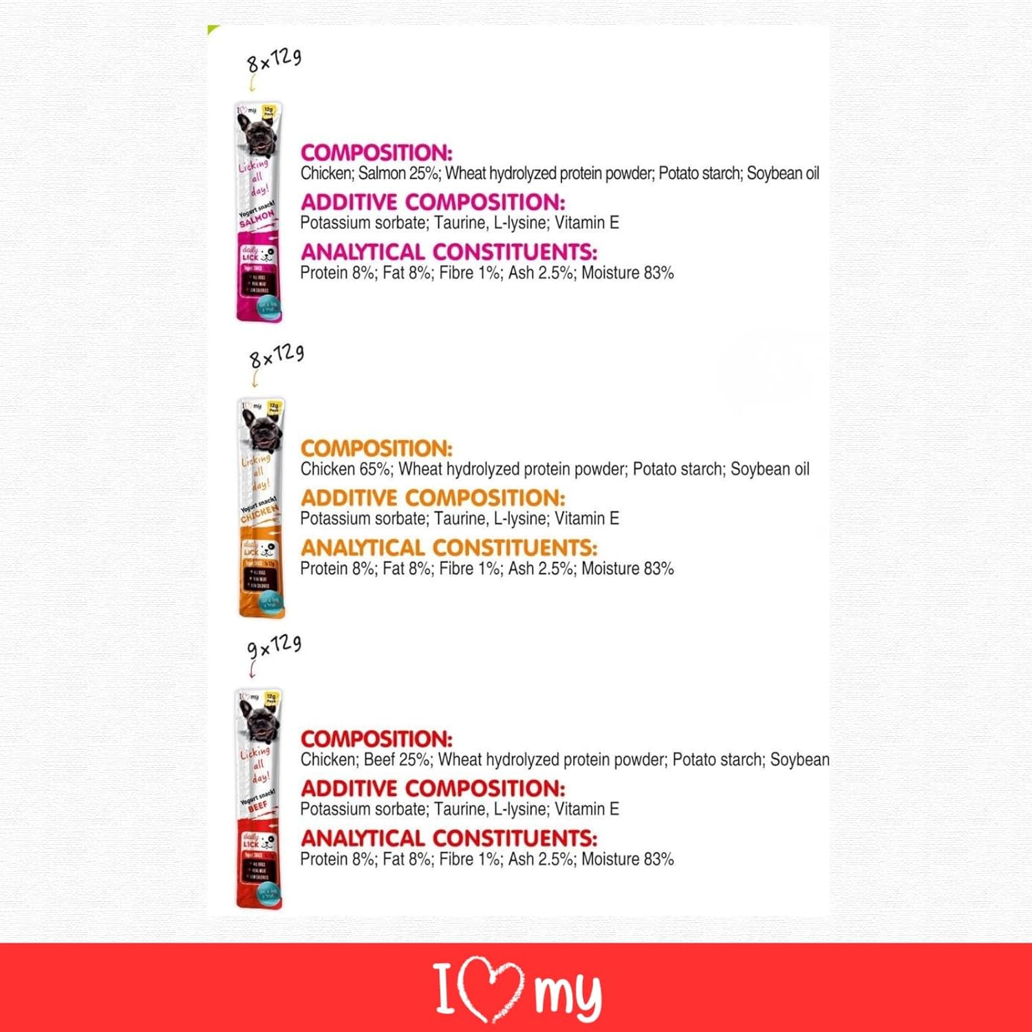 - Mixed Flavour Delight 25 Pack: Spoil your cat with 25 creamy yoghurt-based lickable treats from I Love My Pet. Each 12g pouch delivers a luxurious experience packed with real meat. Flavours include 9 Beef, 8 Chicken and 8 Salmon to keep mealtime exciting and satisfying.