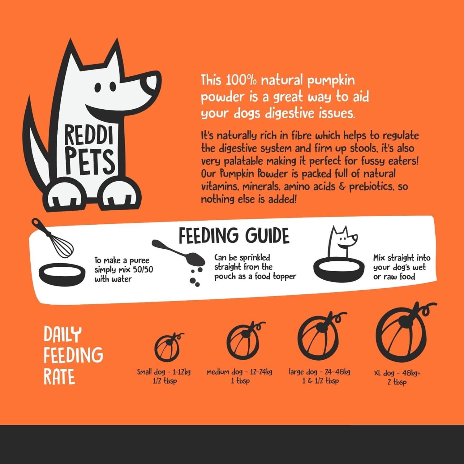 Supports healthy digestion: Naturally high in fibre, pumpkin powder helps regulate your dog’s digestive system, supporting healthy bowel movements and gut balance. Ideal for dogs with sensitive stomachs or occasional digestive upset. Firms up loose stools: The soluble fibre in pumpkin absorbs excess water in the gut, helping to firm stools and support dogs experiencing diarrhoea or inconsistent digestion, while remaining gentle and easy to digest. Helps constipation & gut balance: Pumpkin works both ways by adding bulk to stools and supporting natural intestinal movement, making it suitable for dogs experiencing mild constipation or irregular digestion. 100% natural & gentle formula: Made from pure dried pumpkin with no additives, fillers, grains or preservatives. Naturally rich in vitamins, minerals and prebiotic fibre to support digestive and overall wellbeing. Versatile feeding & enrichment use: Simply sprinkle onto food, mix into wet or raw meals, or add water to create a smooth purée. The purée can also be spread onto dog enrichment toys such as lick mats, helping keep dogs calm and engaged.